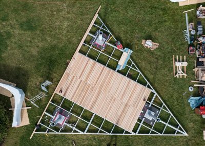 The pavilion provides a space for events, concerts, relaxation, and conversations. Built as a simple assembly, its components and materials are designed for reuse and recycling, making it easy to move or rebuild in new locations.