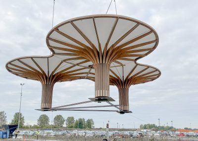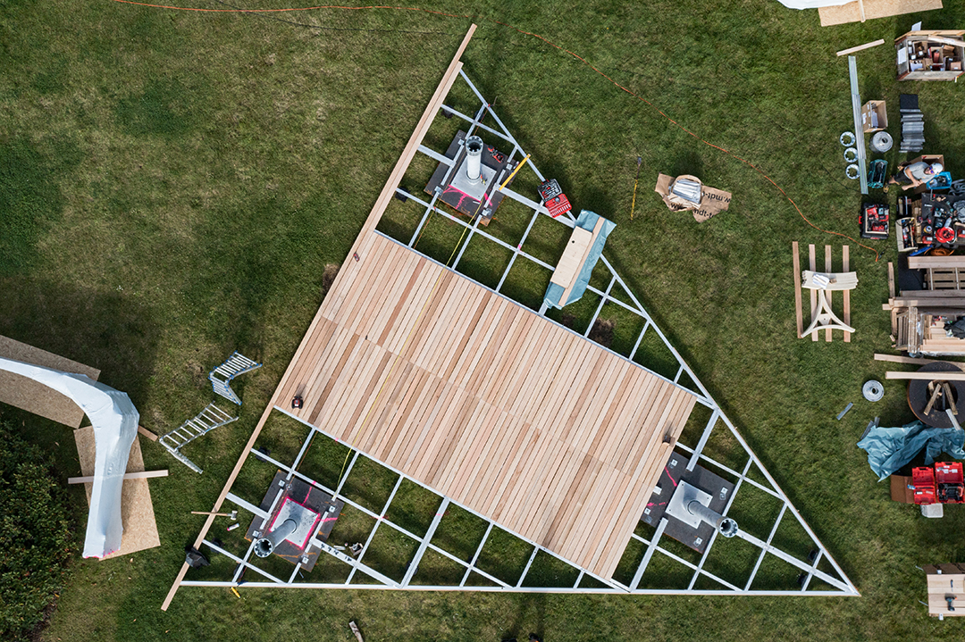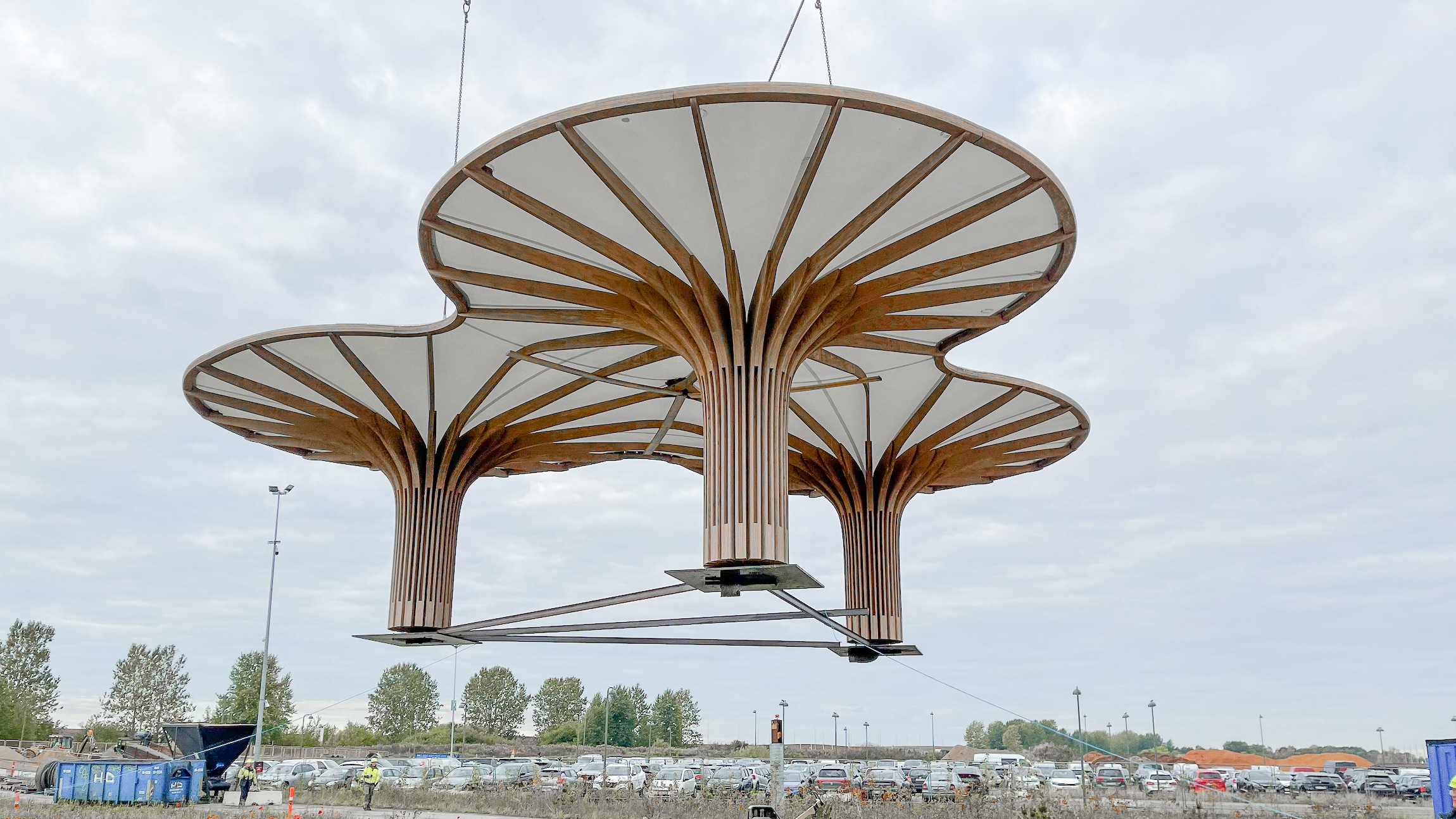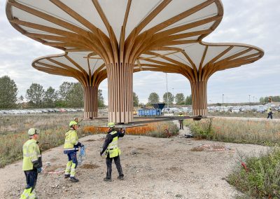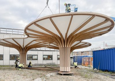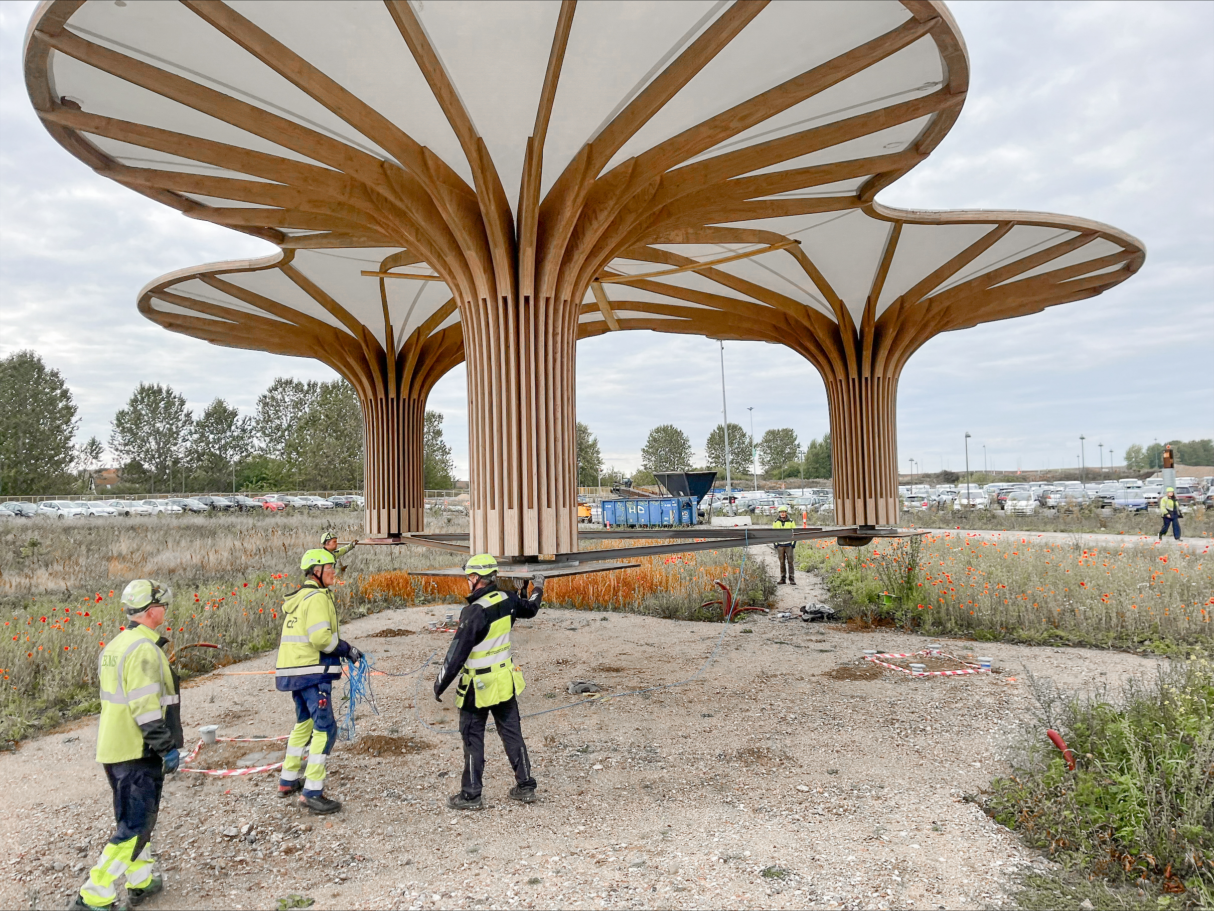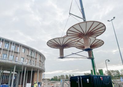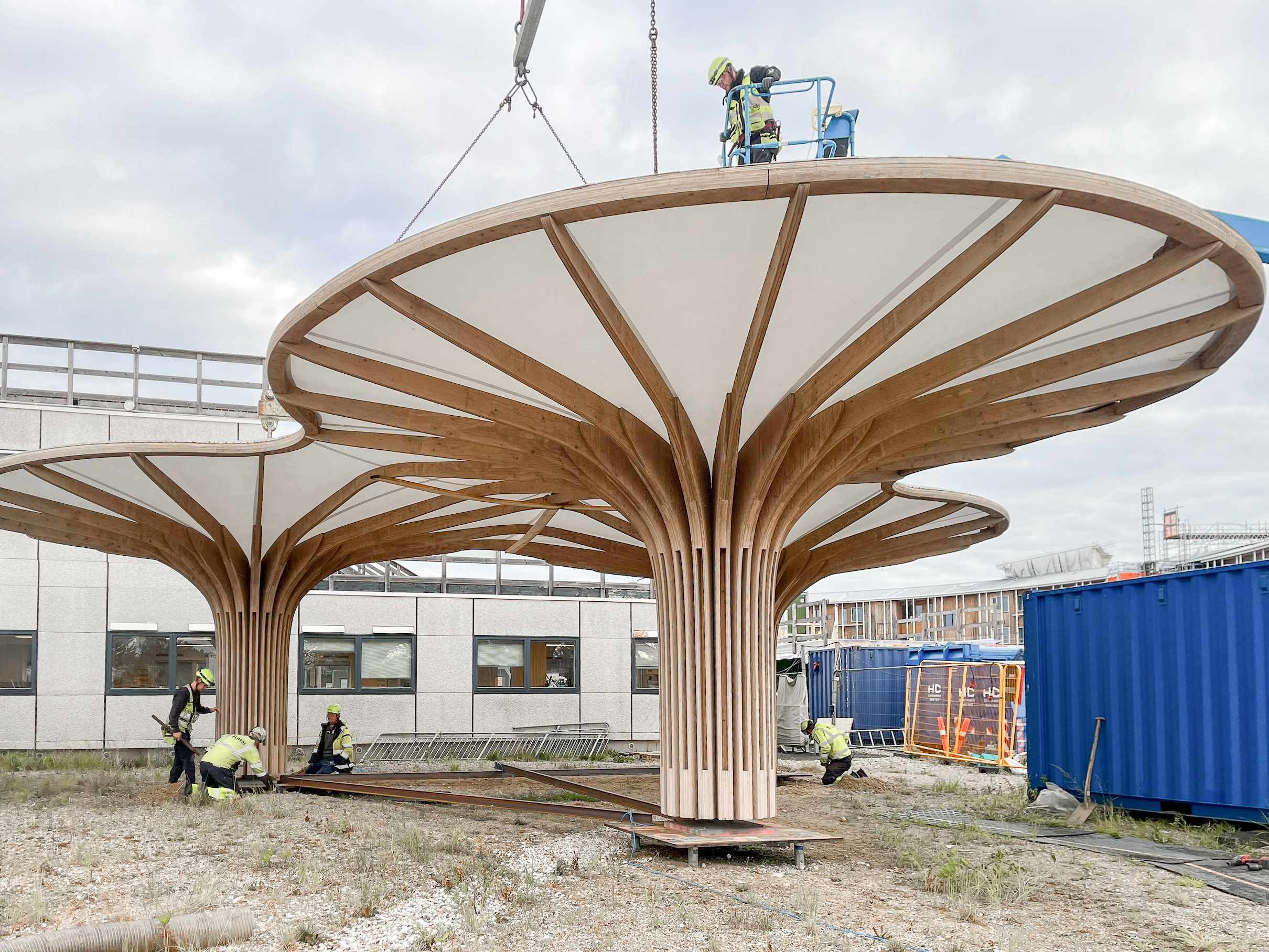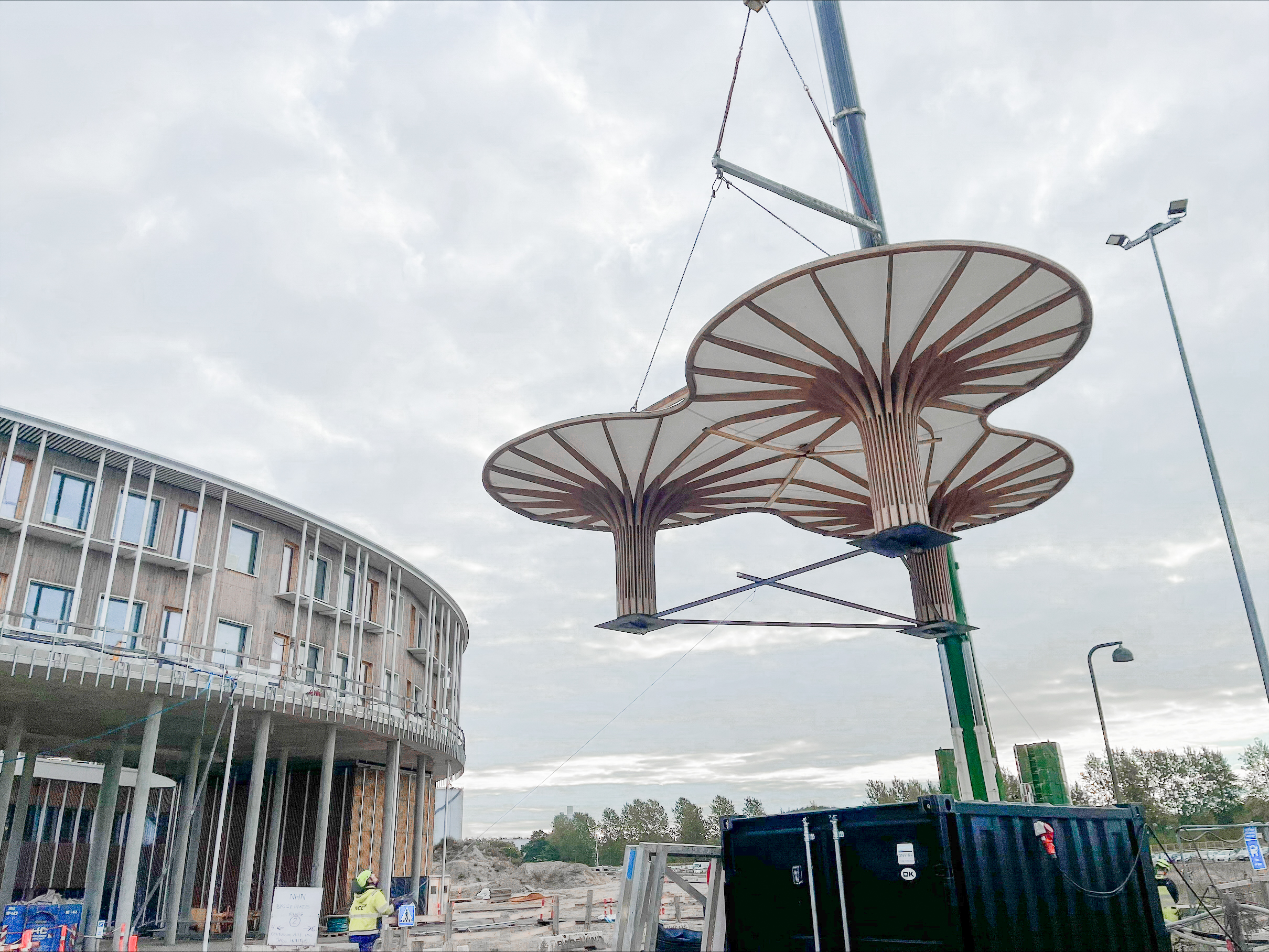 We just got these photos from the ‘Into the Woods Pavilion’ flying to its new and final destination at Nyt Hospital Nordsjælland!