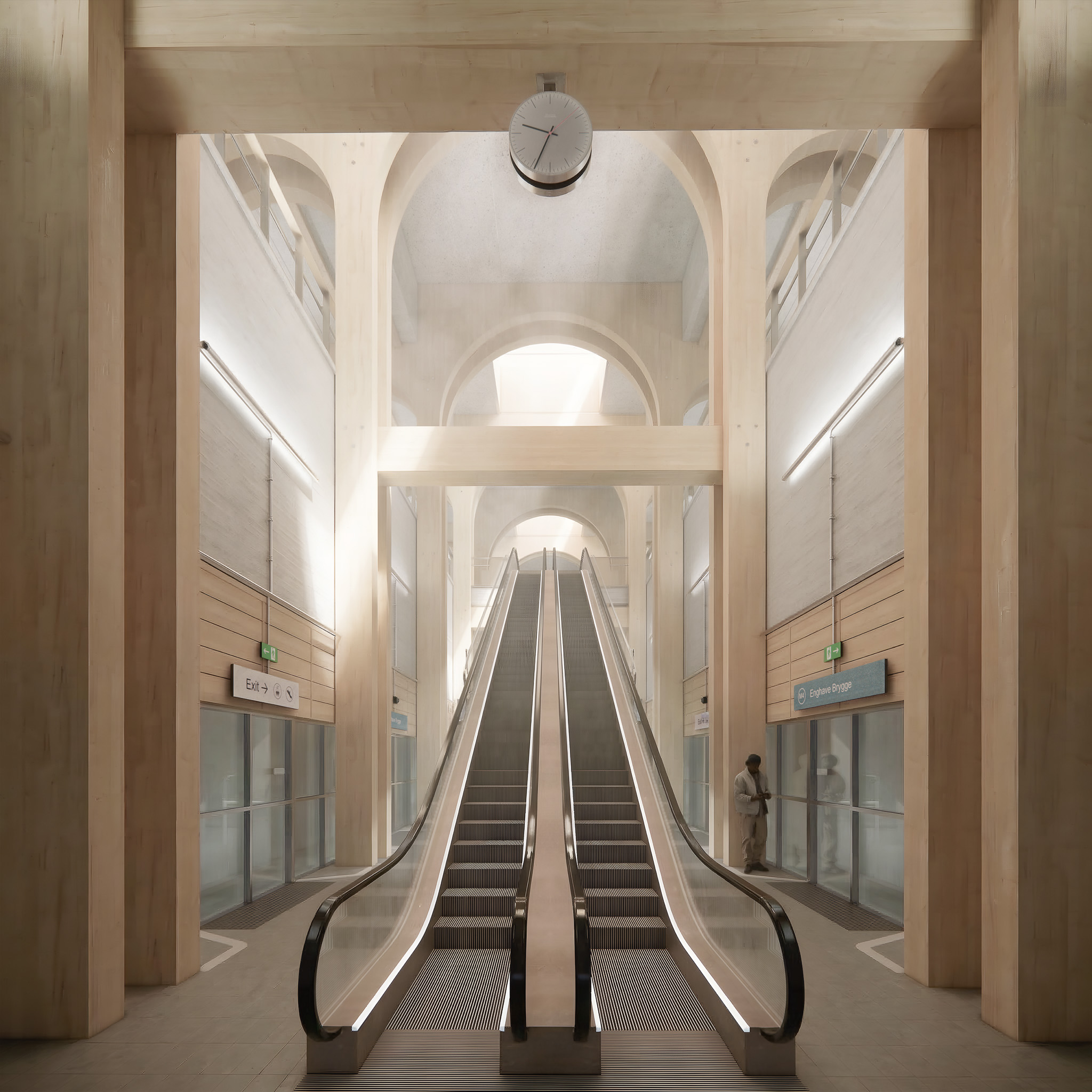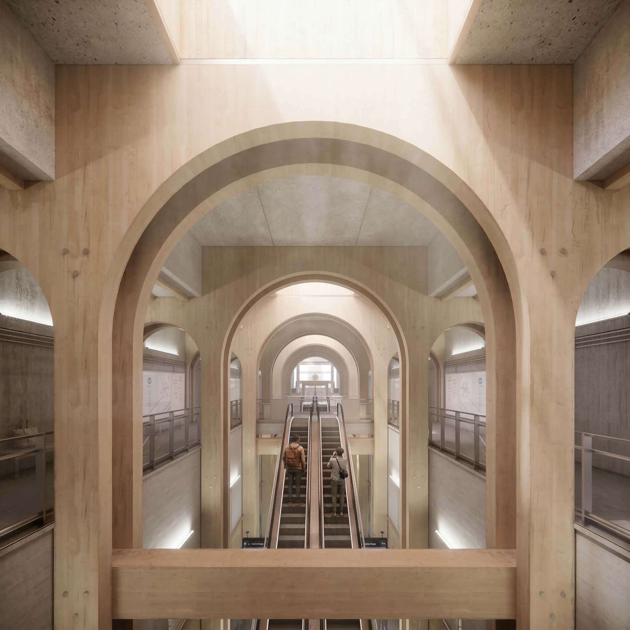 We wanted to take the competition scope a step further and developed these sketches. A visible structure in wood, supporting the station’s roof in combination with the concrete structures, is a less emitting choice giving a radically architectural concept. It is visionary but also based on realistic terms and principles.
