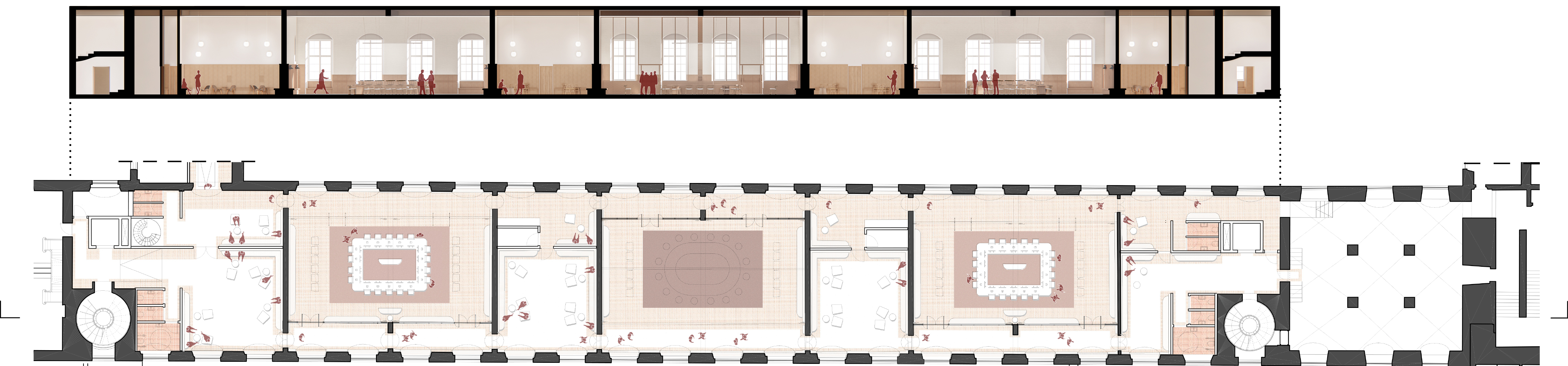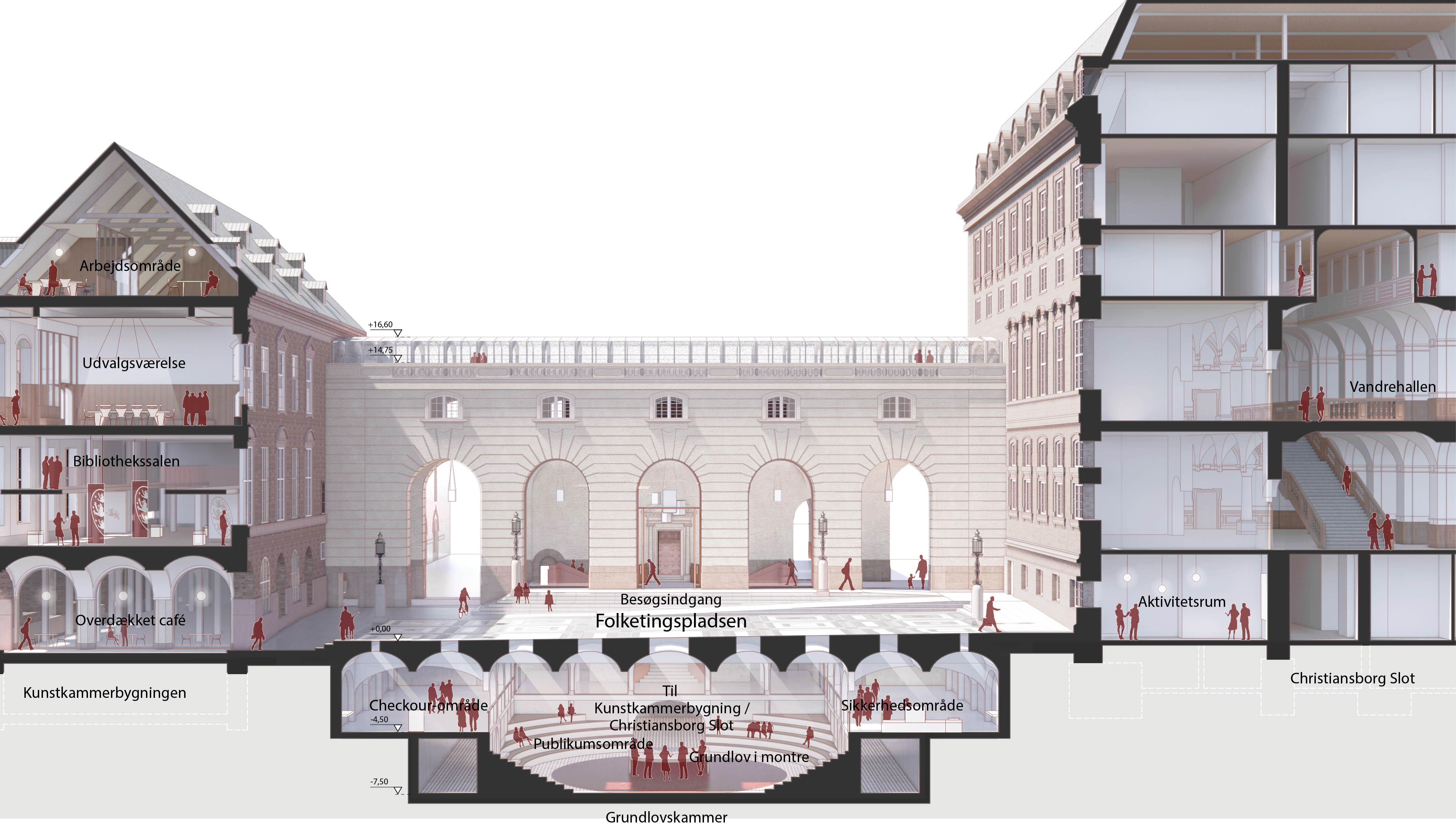 In our proposal, The Art Chamber Building and the corridor buildings ’open up’ functionally and experientially towards the square, contributing to a vibrant and attractive parliament plaza that naturally, both in terms of functionality and building preservation, incorporates the arrival of both the new visitor area and the new framework for the Danish Parliament.