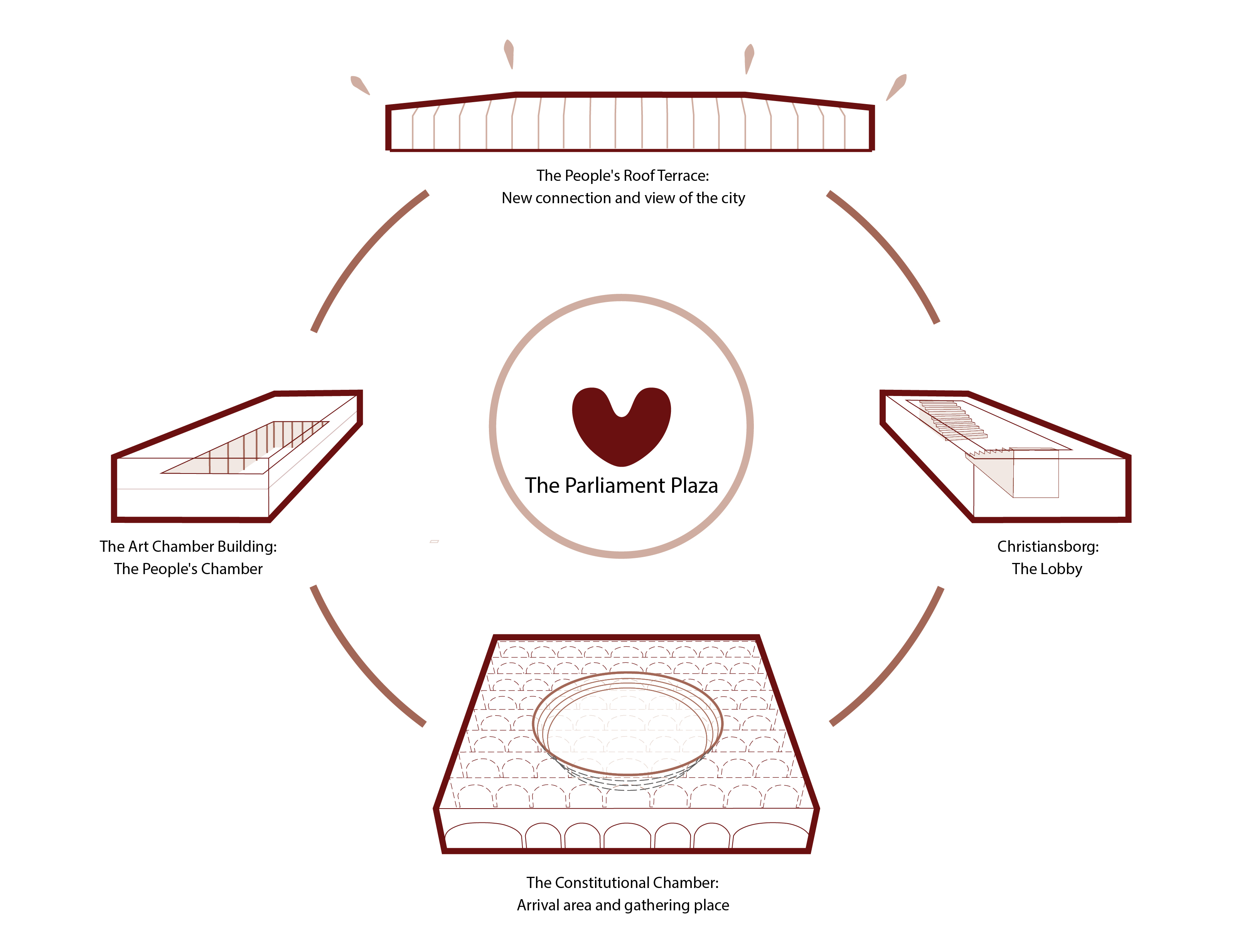 Our ambition is to make the organisation and architectural design a natural extension of the existing framework of the Danish Parliament. The Parliament square is the nerve centre of our proposal and around it, the parliament is tied together.